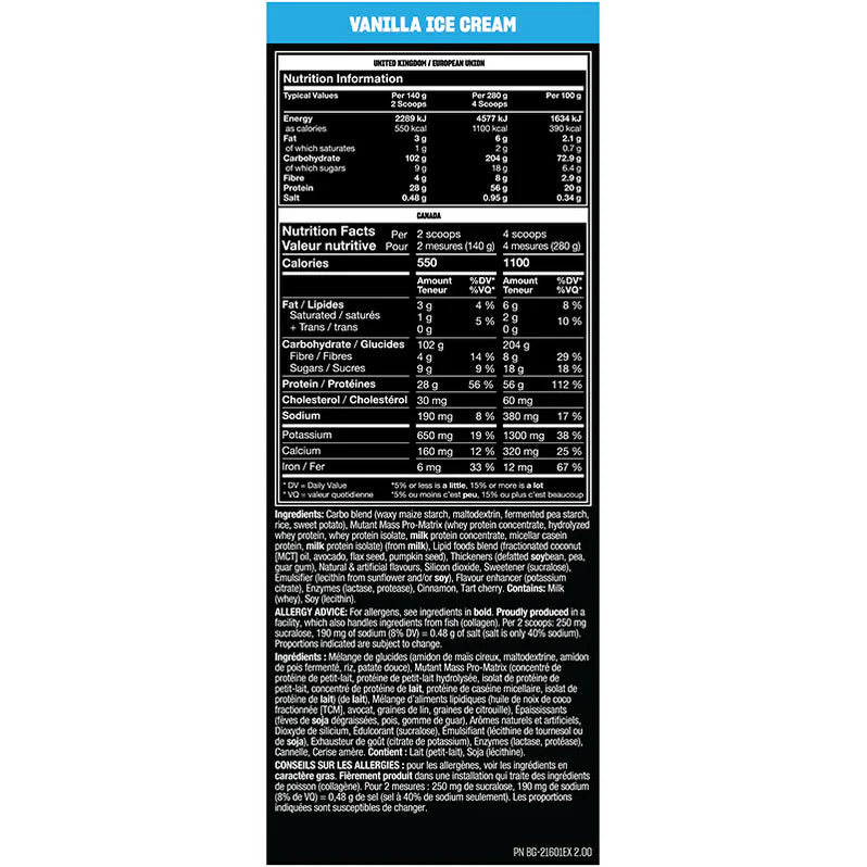 Mutant Mass est une formule de gainer puissante conçue pour les athlètes sérieux qui veulent augmenter leur masse musculaire rapidement. Avec plus de 1000 calories par portion, enrichies de protéines multi-sources, de glucides complexes, d’acides gras essentiels et d’enzymes digestives, Mutant Mass vous aide à franchir un cap dans votre développement physique.